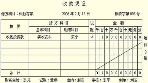 收款憑證左上角的“借方科目”按收款的性質(zhì)填寫“庫存現(xiàn)金”或“銀行存款”;日期填寫的是填制本憑證的日期;右上角填寫填制收款憑證的順序號;“摘要”填寫對所記錄的經(jīng)濟業(yè)務的簡要說明;“貸方科目”填寫與收入“庫存現(xiàn)金”或“銀行存款”相對應的會計科目;“記賬”是指該憑證已登記賬簿的標記,防止經(jīng)濟業(yè)務重記或漏記;“金額”是指該項經(jīng)濟業(yè)務的發(fā)生額;該憑證右邊“附件×張”是指本記賬憑證所附原始憑證的張數(shù);最下邊分別由有關(guān)人員簽章,以明確經(jīng)濟責任。
