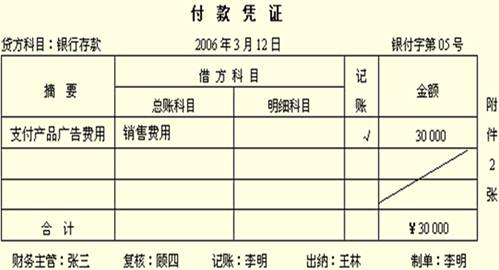 付款憑證是根據(jù)審核無誤的有關(guān)庫存現(xiàn)金和銀行存款的付款業(yè)務的原始憑證填制的。付款憑證的填制方法與收款憑證基本相同,不同的是在付款憑證的左上角應填列貸方科目,即“庫存現(xiàn)金”或“銀行存款”科目,“借方科目”欄應填寫與“庫存現(xiàn)金”或“銀行存款”相對應的一級科目和明細科目。