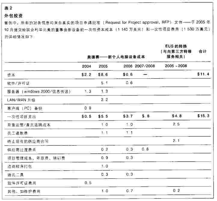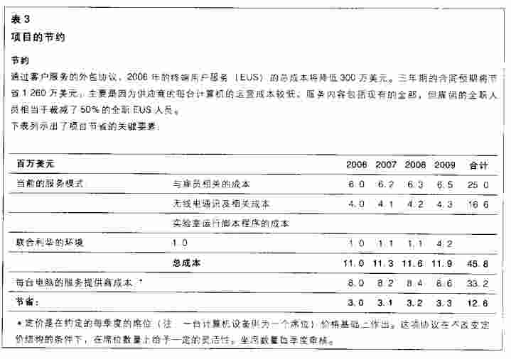 表3概括了外包協(xié)議所帶來(lái)的預(yù)期節(jié)省。這種節(jié)約模式將第三方供應(yīng)商對(duì)“每個(gè)席位”或“每臺(tái)個(gè)人電腦”的定價(jià)與聯(lián)合利華現(xiàn)有終端用戶服務(wù)(EUS)的服務(wù)模式成本進(jìn)行對(duì)比。與聯(lián)合利華當(dāng)前的營(yíng)運(yùn)成本對(duì)比,預(yù)計(jì)每年將節(jié)約1 260萬(wàn)美元。