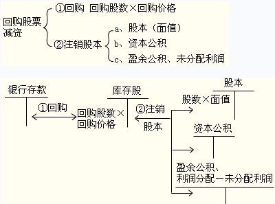 股份有限公司以收購(gòu)本企業(yè)股票方式減資的,按注銷股票的面值總額減少股本,購(gòu)回股票支付的價(jià)款超過(guò)面值總額的部分,依次沖減“資本公積”、“盈余公積”和“利潤(rùn)分配——未分配利潤(rùn)”等科目;相反增加資本公積(股本溢價(jià))。