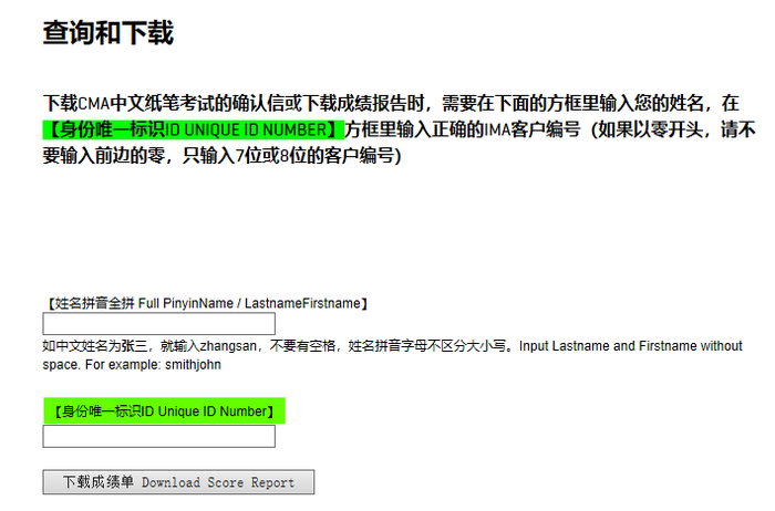 下載cma中文考試的確認(rèn)信或下載成績報告時,需要在下面的方框里輸入考生姓名,在【身份唯一標(biāo)識ID Unique ID Number】方框里輸入正確的IMA客戶編號(如果以零開頭,請不要輸入前邊的零,只輸入7位或8位的客戶編號)。