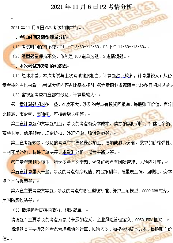 2021年11月份CMA考試P2部分已于11月6日18:30結(jié)束!參加考試的小伙伴們,你們發(fā)揮的如何呢?小編要在此預(yù)祝大家都能順利通過!為了讓大家更好的了解本次CMA考試P2部分的考情分析,特為大家?guī)砹艘韵戮蕛?nèi)容,如果你也好奇這次考試的難度,那就前來關(guān)注吧!