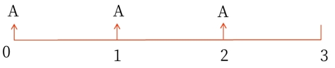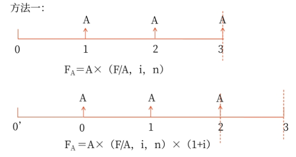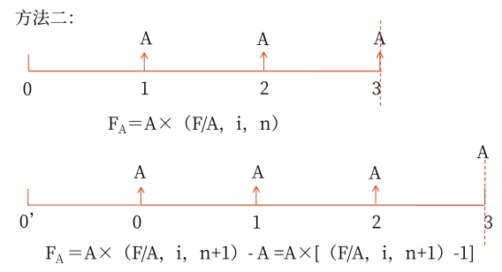 公式 | 方法一:FA=A×(F/A,i,n)×(1+i) 方法二:FA=A×(F/A,i,n+1)-A =A×[(F/A,i,n+1)-1] |