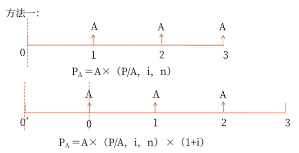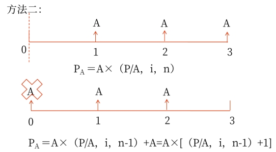 公式 | 方法一:PA=A×(P/A,i,n)×(1+i) 方法二:PA=A×(P/A,i,n-1)+A =A×[(P/A,i,n-1)+1] |