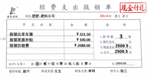 20×4-2-2 | 記-002 | 張三報銷出差上海車票及補助 | 2509.50 | 借 | 97,316.50 |