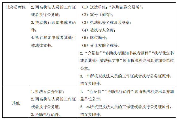 (五)明確、具體的執(zhí)行內(nèi)容:凍結(jié)會(huì)員席位的,列明席位編號(hào)、凍結(jié)期限等;續(xù)凍會(huì)員席位的,列明原凍結(jié)席位編號(hào)、原凍結(jié)日期及續(xù)凍期限等;解凍會(huì)員席位的,列明原凍結(jié)席位編號(hào)、原凍結(jié)日期等;強(qiáng)制轉(zhuǎn)讓會(huì)員席位的,列明被執(zhí)行人全稱(chēng)、席位編號(hào)及受讓方的全稱(chēng)等。