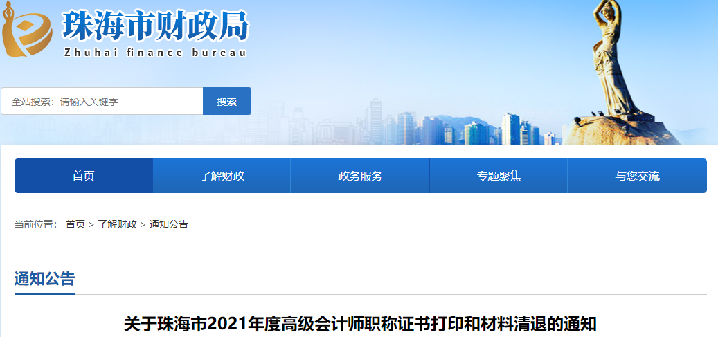 廣東珠海2021年高級會計師職稱證書打印和材料清退的通知