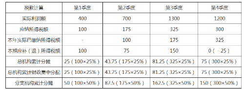 一是調(diào)整總分機構(gòu)稅款分攤計算方法。將匯繳環(huán)節(jié)總分機構(gòu)分攤稅款計算方法推廣至預(yù)繳環(huán)節(jié),即企業(yè)先對截止到本月(季)度應(yīng)納所得稅額進行分攤,再由總、分機構(gòu)分別抵減其已分攤預(yù)繳稅款,并計算本月(季)度應(yīng)補(退)所得稅。舉例說明如下: