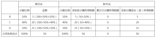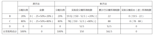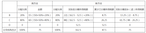需要說明的是,匯總納稅企業(yè)如果不存在注銷分支機構(gòu)、分攤稅款計算不準確等情形,無論按原計算方法,還是按新計算方法,結(jié)果都是一樣的。但是,若匯總納稅企業(yè)前期預(yù)繳環(huán)節(jié)未準確計算分攤稅款或當季發(fā)生分支機構(gòu)注銷情形,新計算方法將通過全量分攤方式,對全年分攤稅款重新計算。案例中,由于第二季度發(fā)現(xiàn)第一季度C、D分支機構(gòu)分配比例計算錯誤,在第二季度申報時按照新方法計算的C分支機構(gòu)應(yīng)補稅額比原方法少5萬元;D分支機構(gòu)應(yīng)補稅額比原方法多5萬元;B分支機構(gòu)分配比例沒有錯誤,兩種方法計算結(jié)果一致。D分支機構(gòu)注銷后,需重新計算分配比例,在第三季度申報時按照新方法計算的B分支機構(gòu)應(yīng)補稅額比原方法少1.75萬元,C分支機構(gòu)應(yīng)補稅額比原方法多1.75萬元。