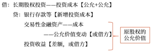 1.長投初始 投資成本 | 權(quán)益法核算的長投初始投資成本【公允+公允】 =原持有股權(quán)投資的公允價(jià)值+新增投資成本的公允價(jià)值 |