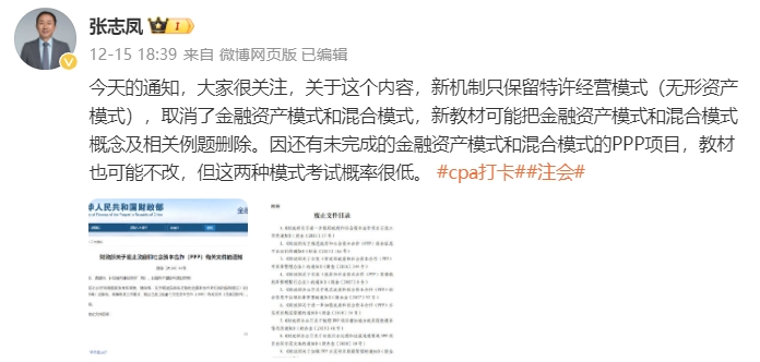 張志鳳老師認為,新機制只保留特許經營模式(無形資產模式),取消了金融資產模式和混合模式,新教材可能把金融資產模式和混合模式概念及相關例題刪除。因還有未完成的金融資產模式和混合模式的PPP項目,教材也可能不改,但這兩種模式考試概率很低。