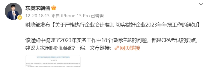 《關于嚴格執(zhí)行企業(yè)會計準則 切實做好企業(yè)2023年年報工作的通知》的發(fā)布則強調了新考季備考的要點。通知中編制了2023年年報應予關注的準則實施重點共18項,這也是從業(yè)人員在實務工作中18個值得注意的重點,考生在備考時應該提起足夠的重視。