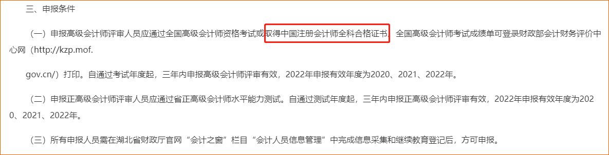 湖北注冊會(huì)計(jì)師可直接申請參加高級(jí)會(huì)計(jì)師評審!湖北省財(cái)政廳發(fā)布的《關(guān)于報(bào)送2022年度湖北省高級(jí)、正高級(jí)會(huì)計(jì)師專業(yè)技術(shù)職務(wù)任職資格評審材料的通知》中標(biāo)明:高級(jí)會(huì)計(jì)師申報(bào)人員應(yīng)通過全國高級(jí)會(huì)計(jì)師資格考試或取得中國注冊會(huì)計(jì)師全科合格證書。這也就是說明,符合條件的湖北注冊會(huì)計(jì)師可免試高會(huì),直接申請參加高級(jí)會(huì)計(jì)師評審。