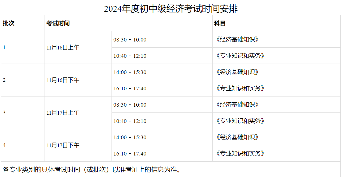 初中級(jí)經(jīng)濟(jì)考試分2天,上、下午共4個(gè)批次實(shí)施(附件1)。各級(jí)別及專業(yè)類別的具體批次劃分和考試時(shí)間以準(zhǔn)考證上的信息為準(zhǔn)。